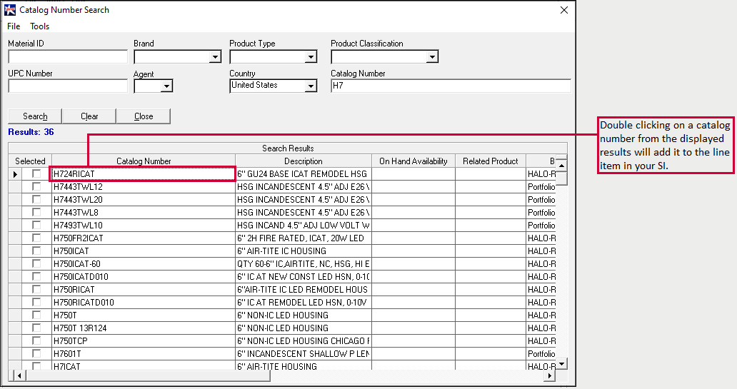 Step 3: Double click on the product you want from the results. The catalog number will be populated in the selected line in your SI. Then, click on save.
